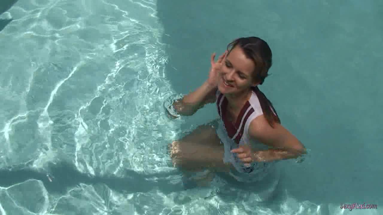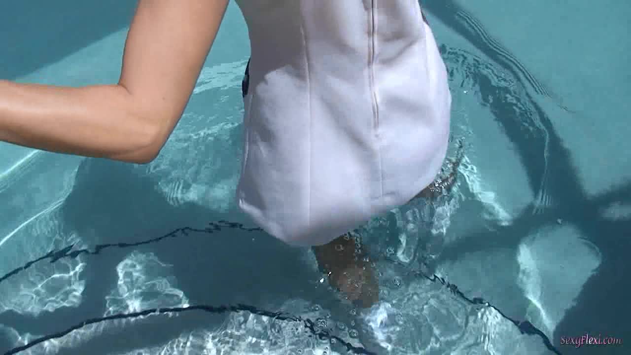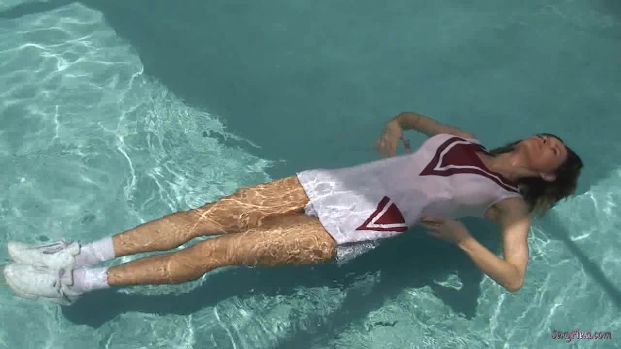 Chantelle in a tennis dress with socks and pantyhose in the pool