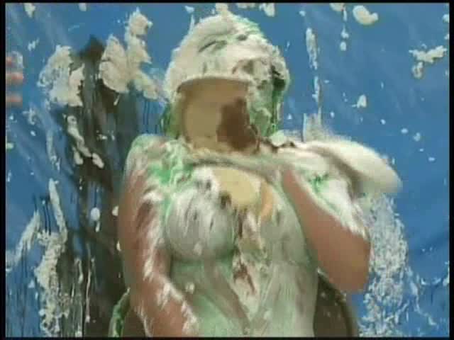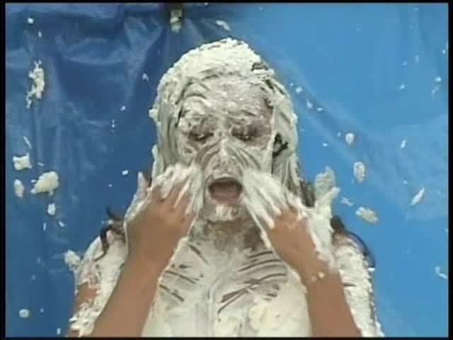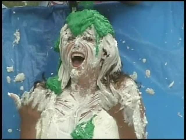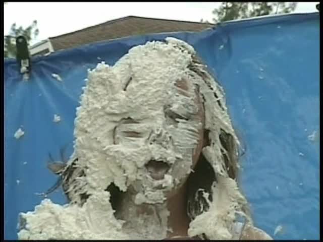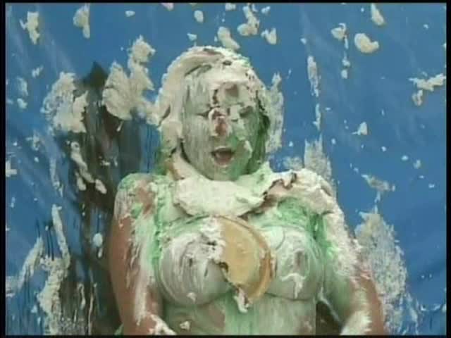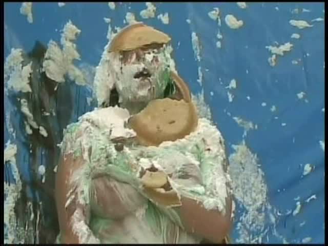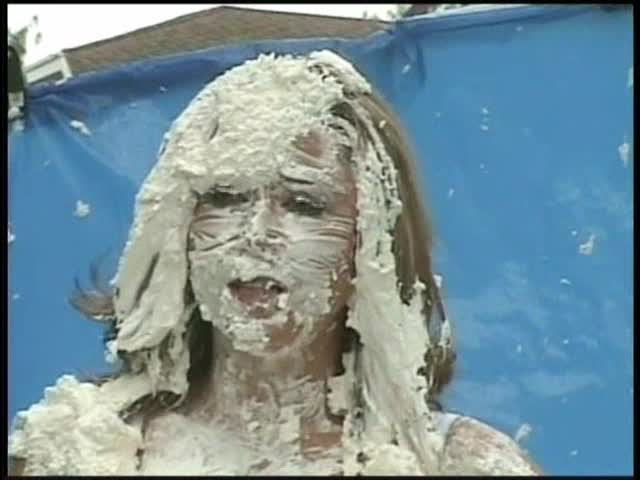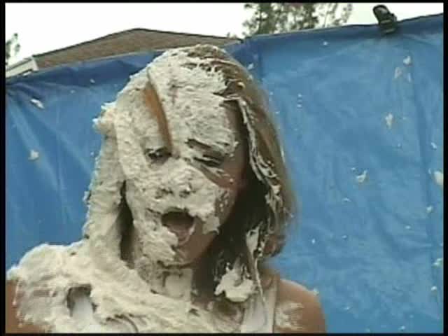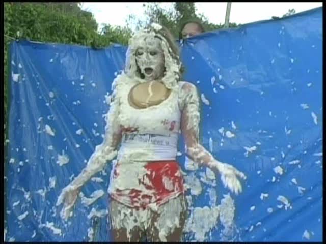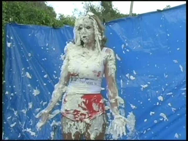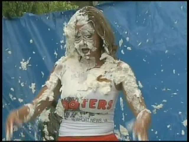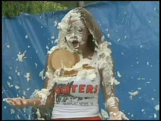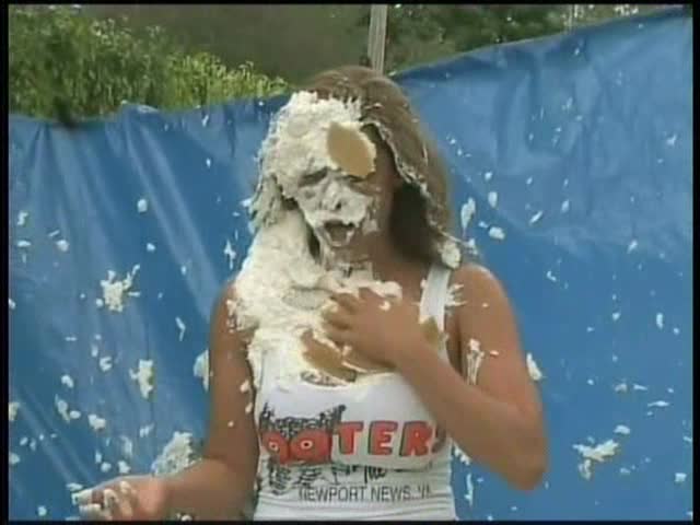 HOOTERS HOSTESS.Christina is a Hooters gal serving a customer. The customer is menacing her with cream pies and finally starts throwing them at her.