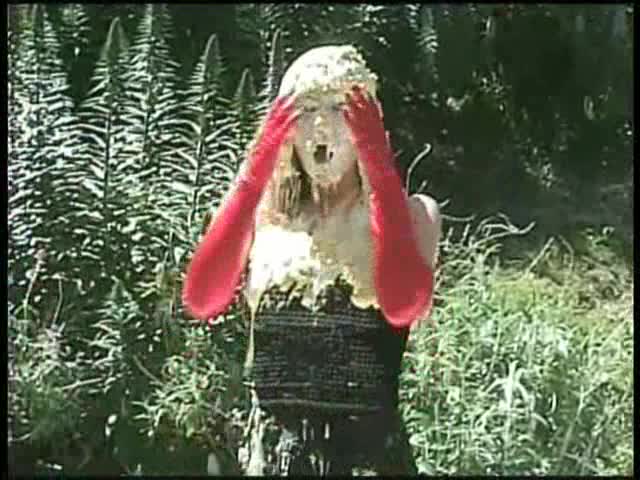 Custom Pie Video - Lauren wearing a stunning black dress and gloves is reciting the poem 15 WHIPPED CREAM PIES ON THE WALL and of course all those eventually end up on her.