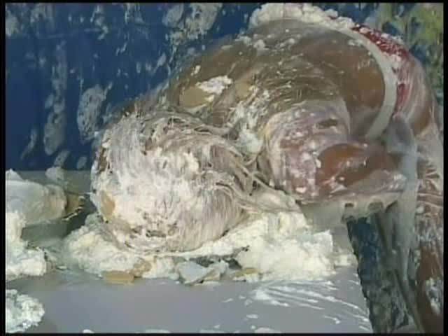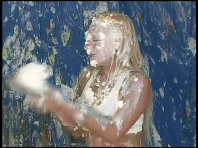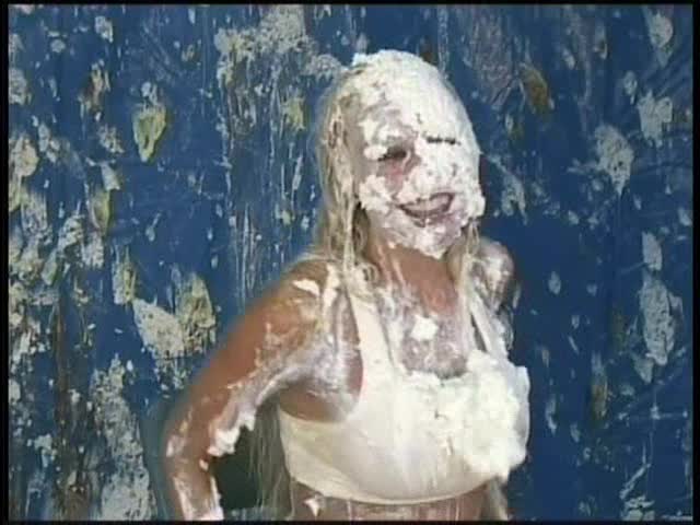 CREAMING CRYSTAL.Crystal in a sports outfit is auditioning for a pie commercial. She is pieing herself at the begining and eventually the entire crew is throwing pies at her.