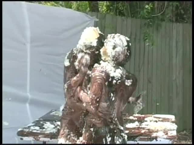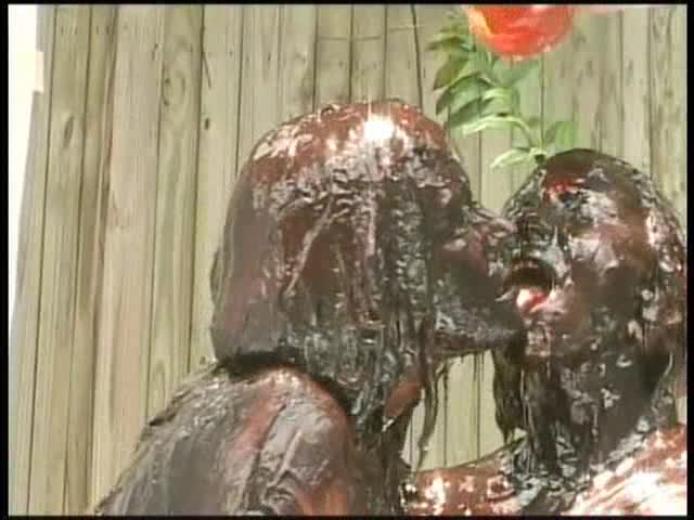 HOT FUDGE SUNDAY AFTERNOON.Renee and Christina are turning each other into chocolate fudge statues. Then chocolate sauce is poured in buckets over each and finally white pies are thrown at each lady. Through it all both are kissing and licking and fondling each other. It is a hot lesbian scene. - c/o LS Prods.