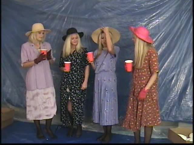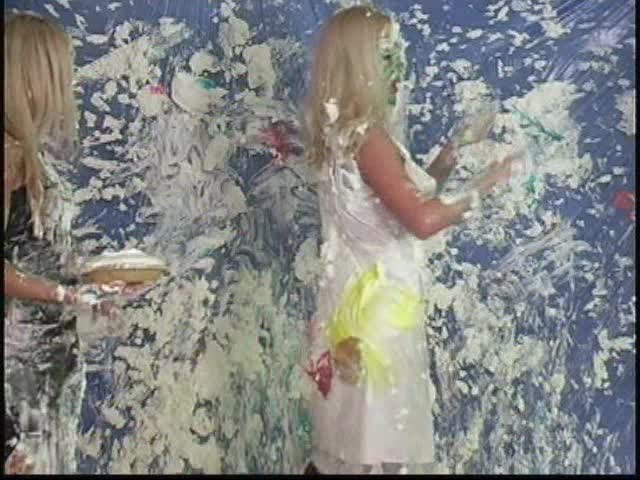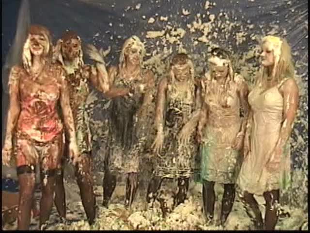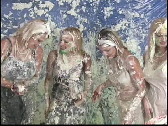 Custom Pie Vid 217 - Charlee Brittany Page and Taylor arrive at a party and an argument starts. Pies fly everywhere and clothing get removed down to slips. Finally Nicole and Christina arrive and are tied up and pied and slimed with chocolate.