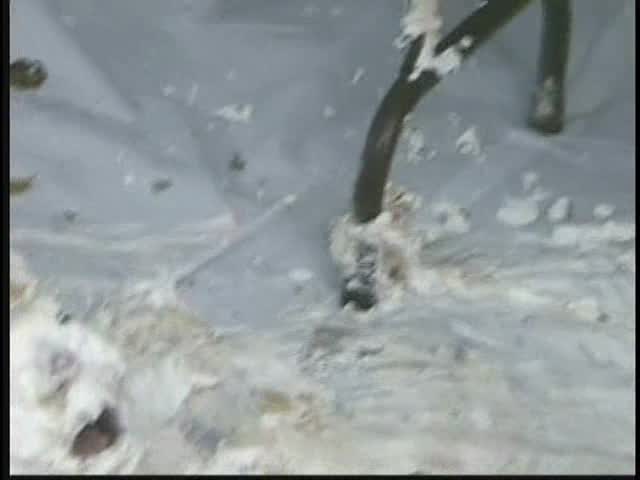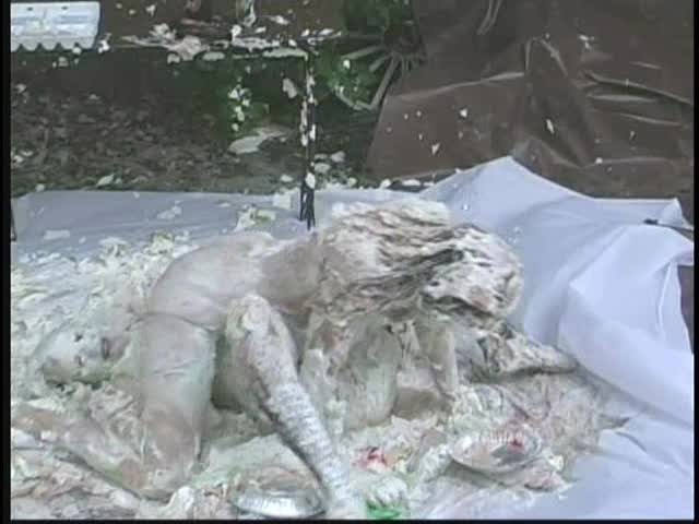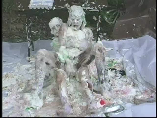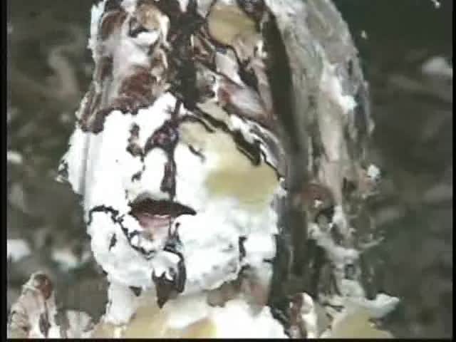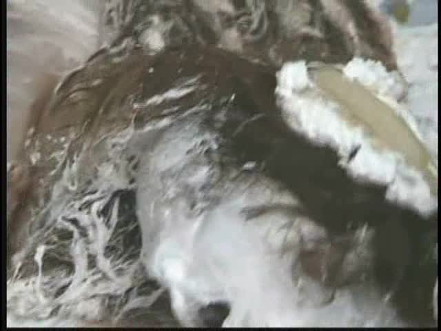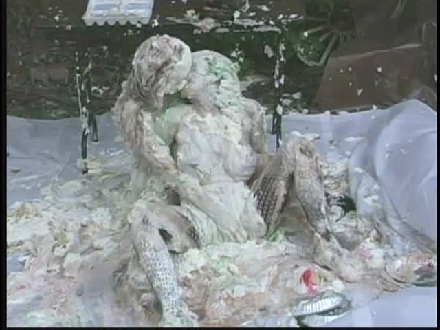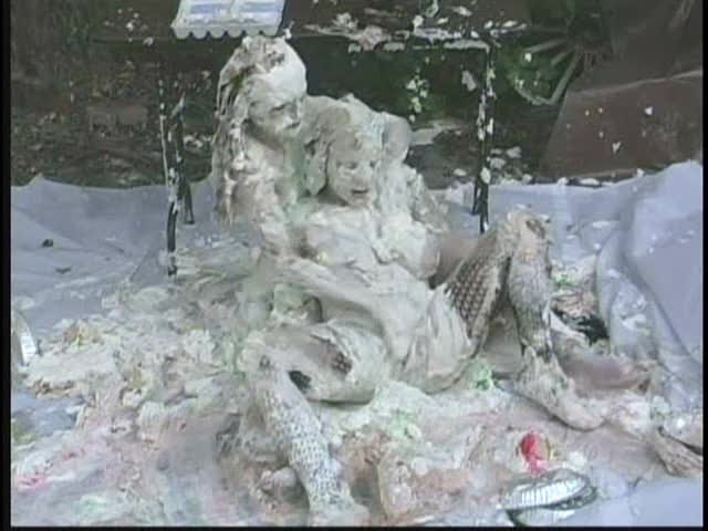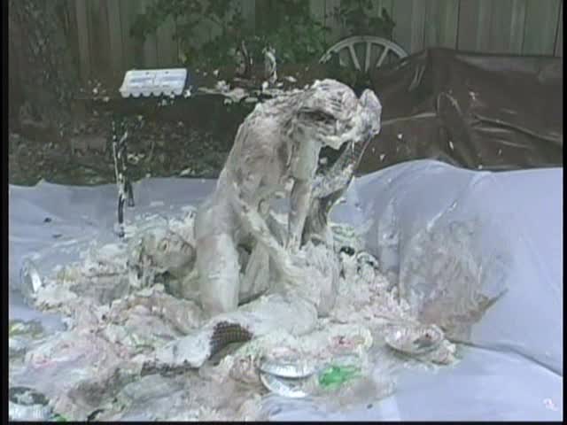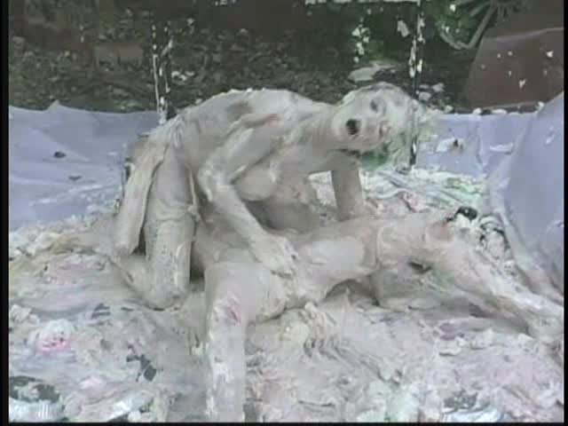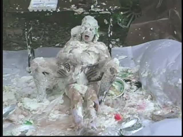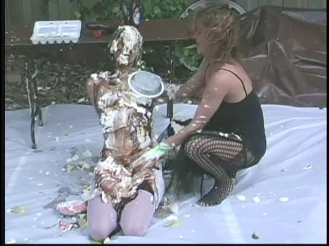 PIED LOVERS. Dominant Sara and Submissive Nicole. Nicole is tied up and under Sara's control. Nicole is first egged then covered in chocolate syrup and then is viciously pied. Sara is so turned on that she starts kissing and licking Nicole and gets pied to