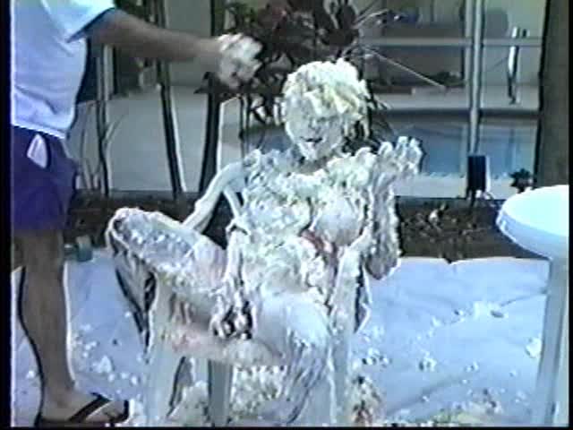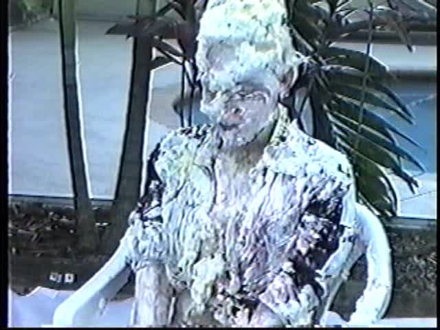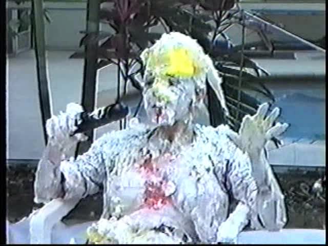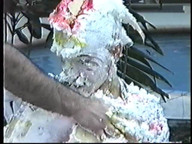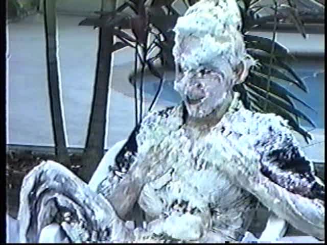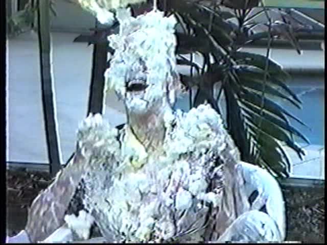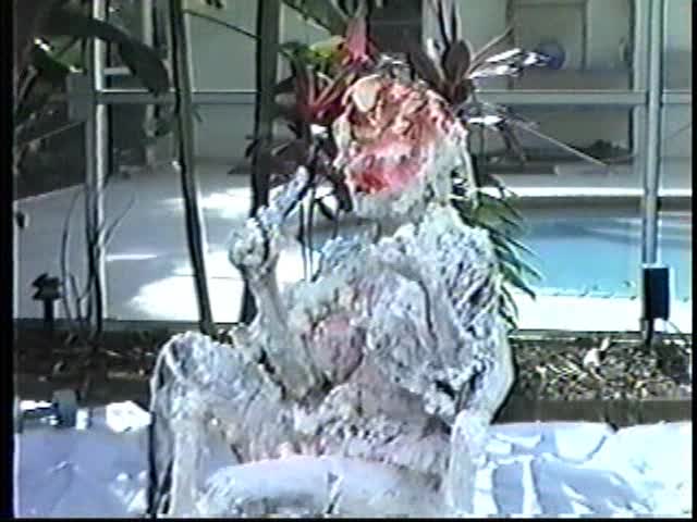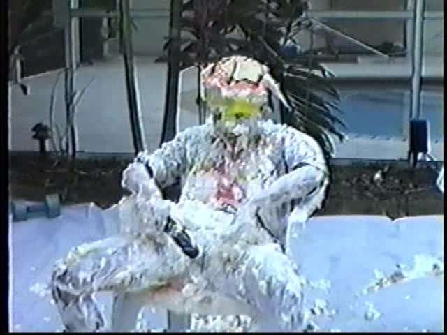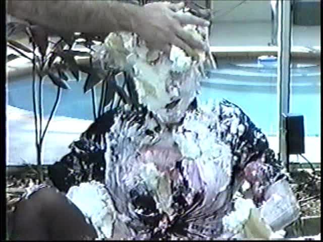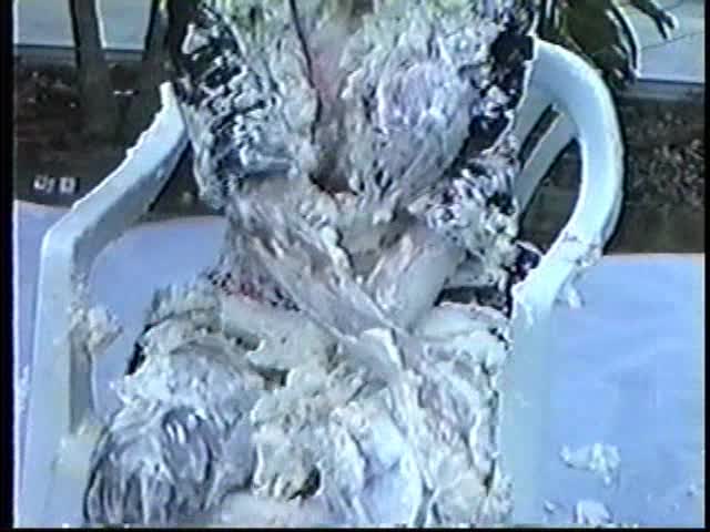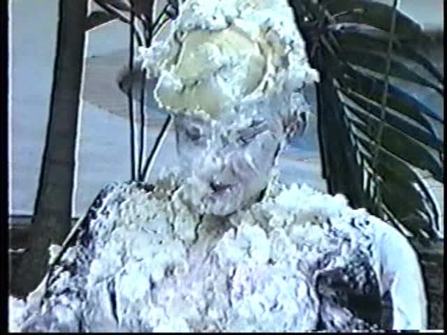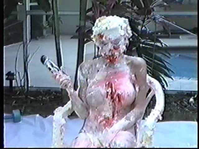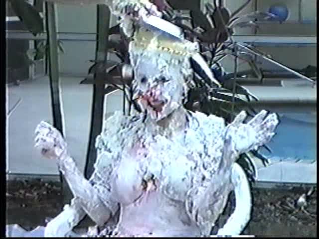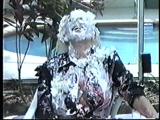 Renee dressed like Brittany Spears…and with a long black dildo…has 45 pies thrown at her.