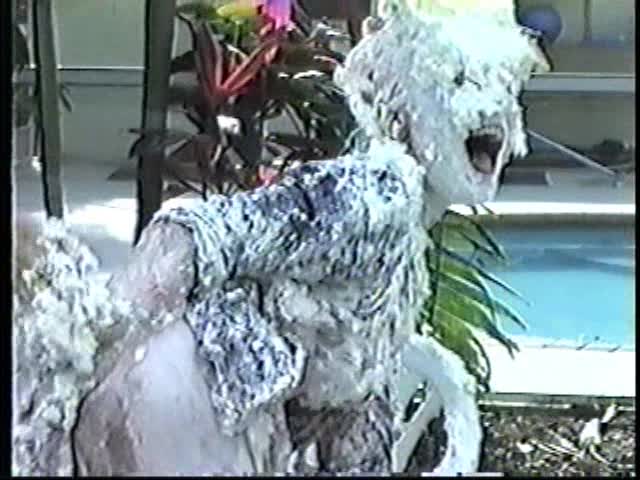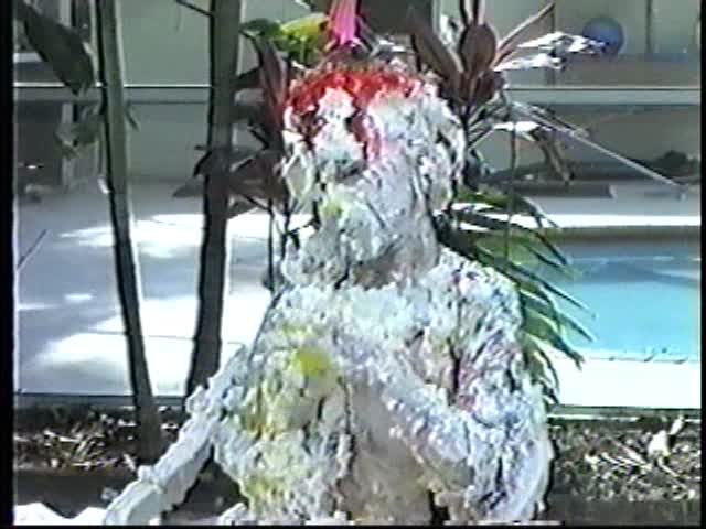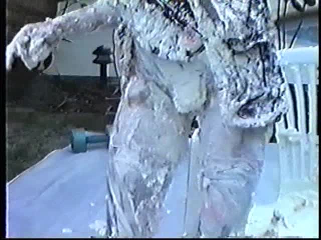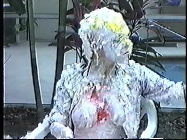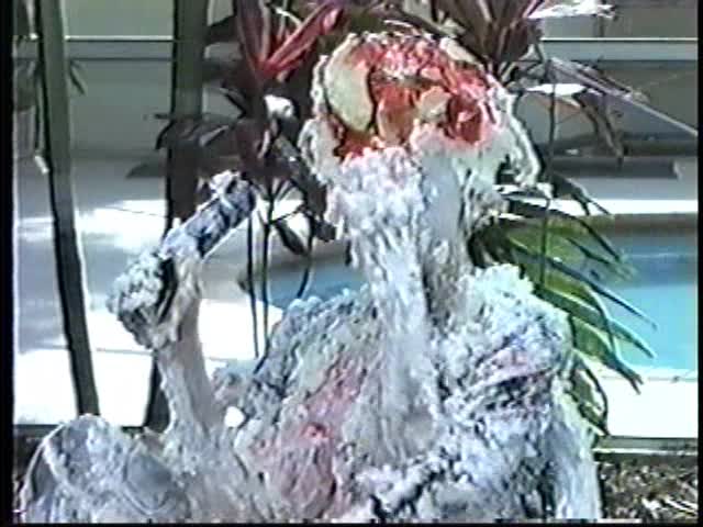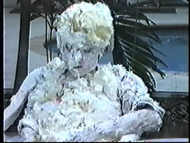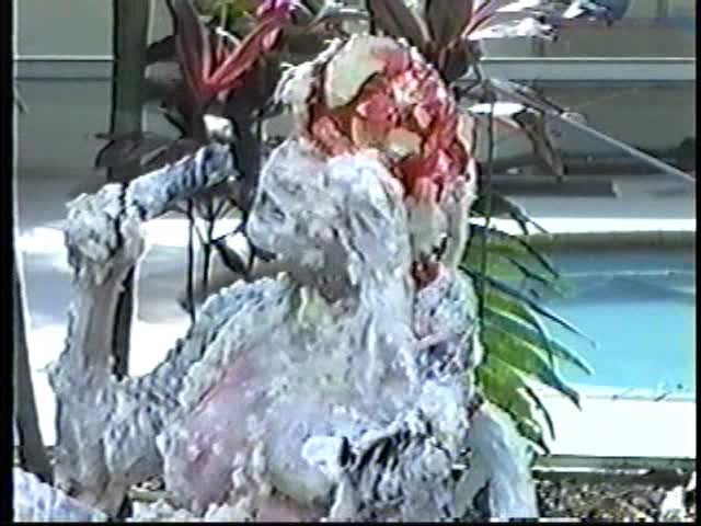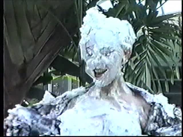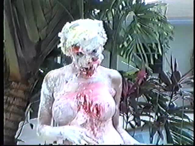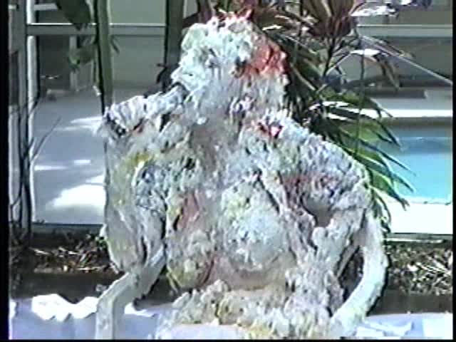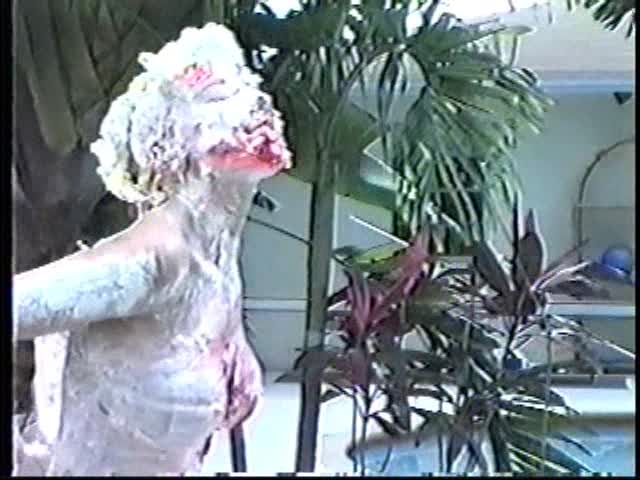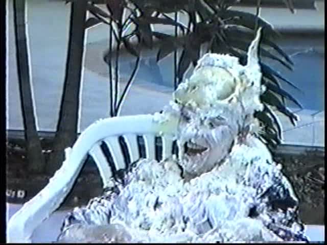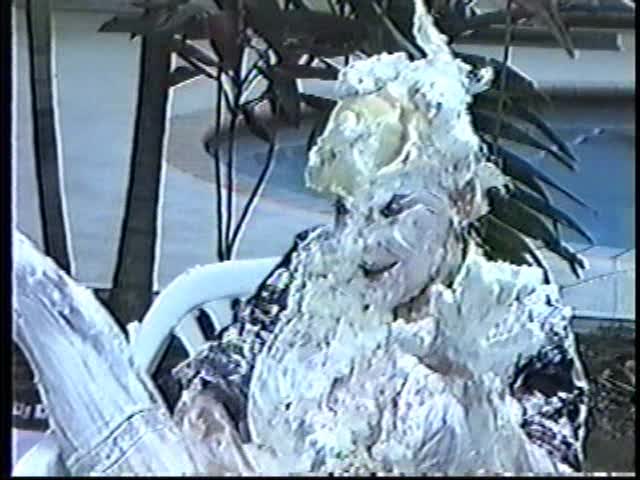 Renee dressed like Brittany Spears…and with a long black dildo…has 45 pies thrown at her.