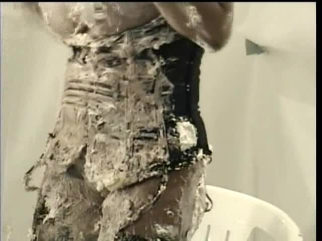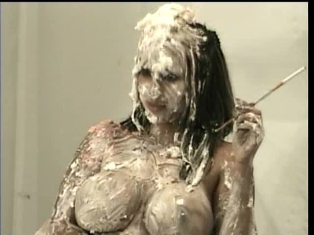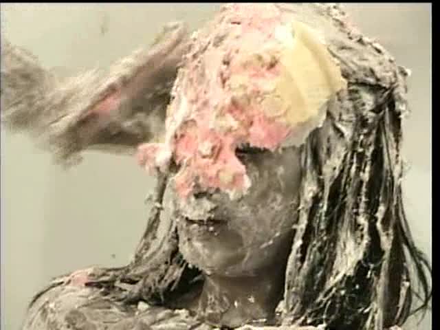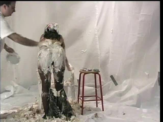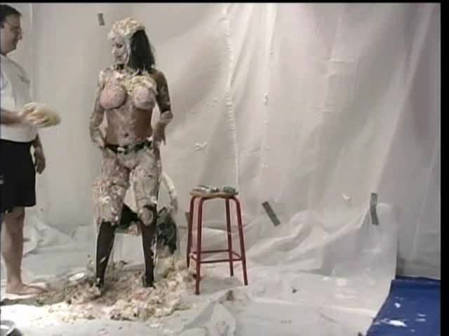 DESSERT FOR THE DIVA. Jess has been so snotty all day that she deserves 100 pies. Dressed in a lovely corset she is sitting and smoking. Well that is all the crew can take and Jess is CREAMED with 100 pies EVERYWHERE